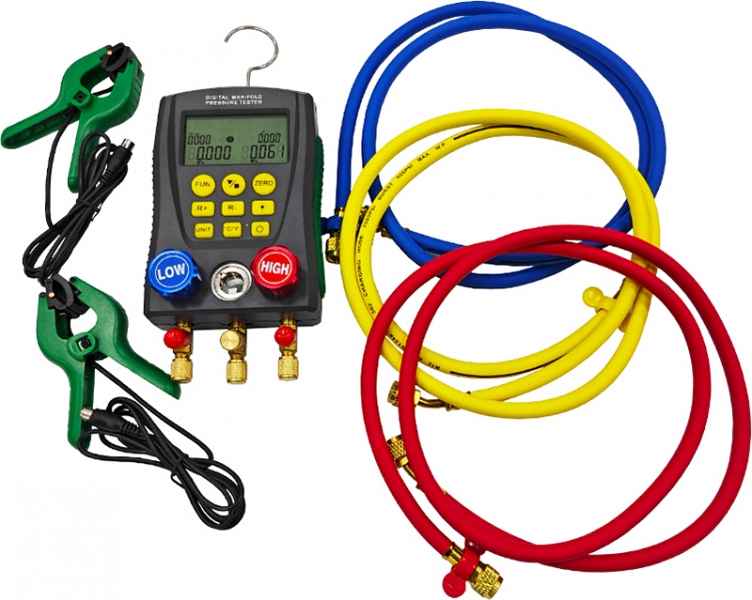 Цифровой манометрический коллектор со шлангами и клеммами в кейсе Voll V-100 Digital (Волл В-100 Диджитал) используется для измерения давления и температуры в системах кондиционирования, тепловых насосов и холодильного оборудования.